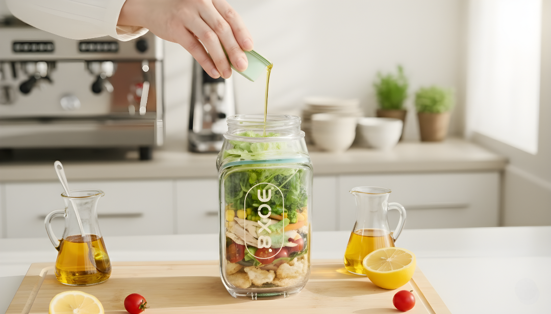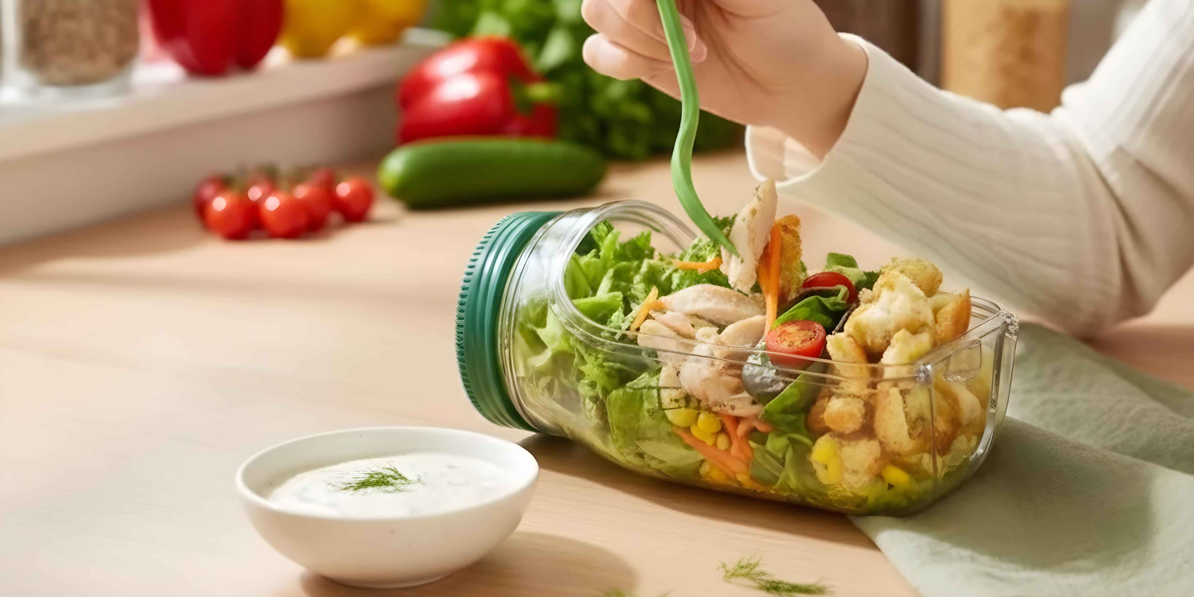 Genoot van lekvrije salades onderweg dankzij de dressingcapsule die alles netjes en schoon houdt.