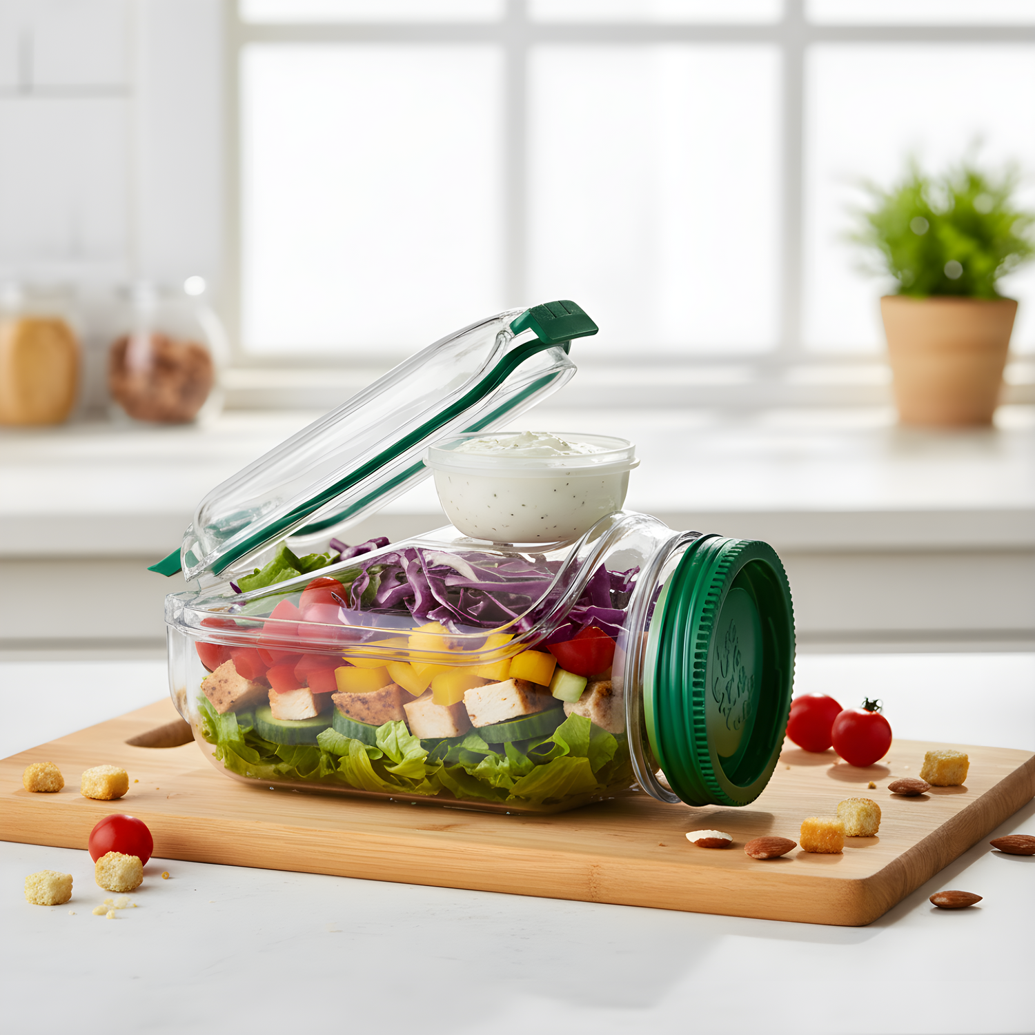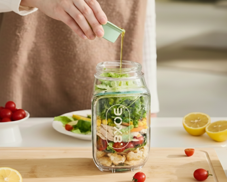 Geniet overal van verse, knapperige salades. De zij-opening, lekvrije dressingcapsule en verticale gelaagdheid zorgen samen dat ingrediënten gescheiden, schoon en perfect vers blijven - gezond eten was nog nooit zo eenvoudig en plezierig.